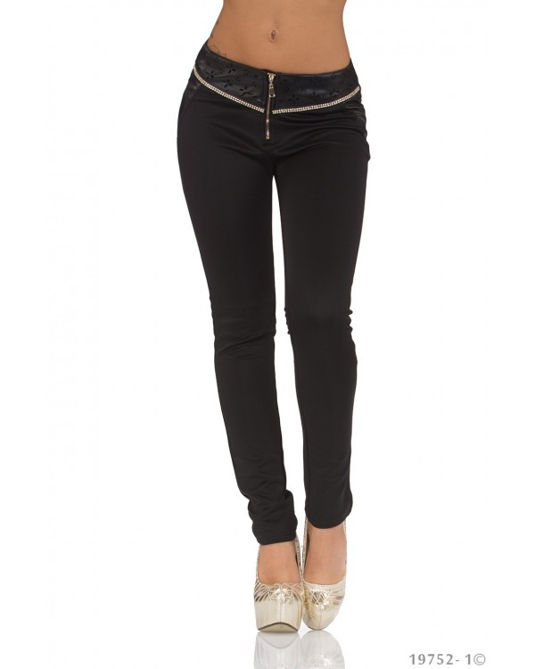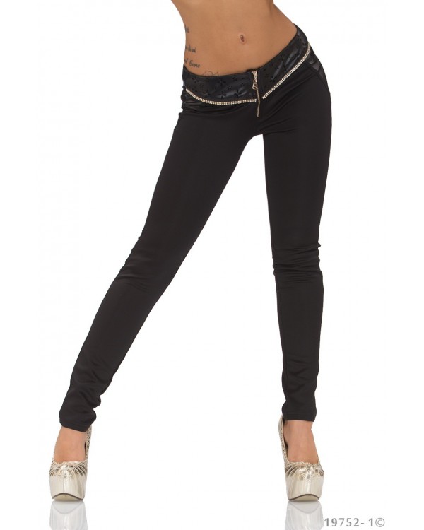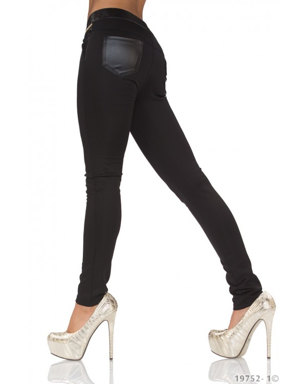 Legice v črnem, rahlo svetlečem videzu, spredaj z zadrgo in lepim okranim detajlom zgoraj. Zadaj žepi usnjenega videza.